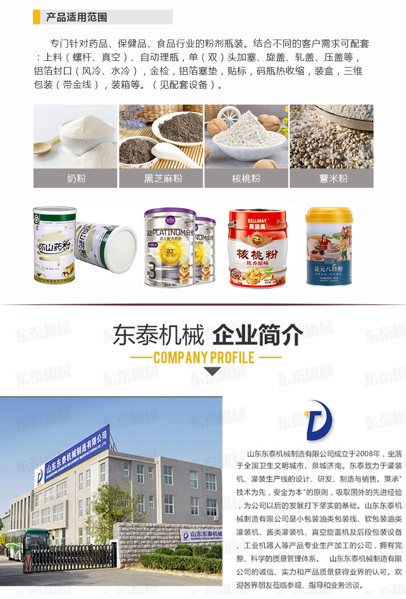 全自動粉劑灌裝機適用于包裝粉末及小顆粒物料,如粉劑、小顆粒劑藥品、獸藥、葡萄糖、調味品、固體飲料、碳粉、爽身粉、農藥等。