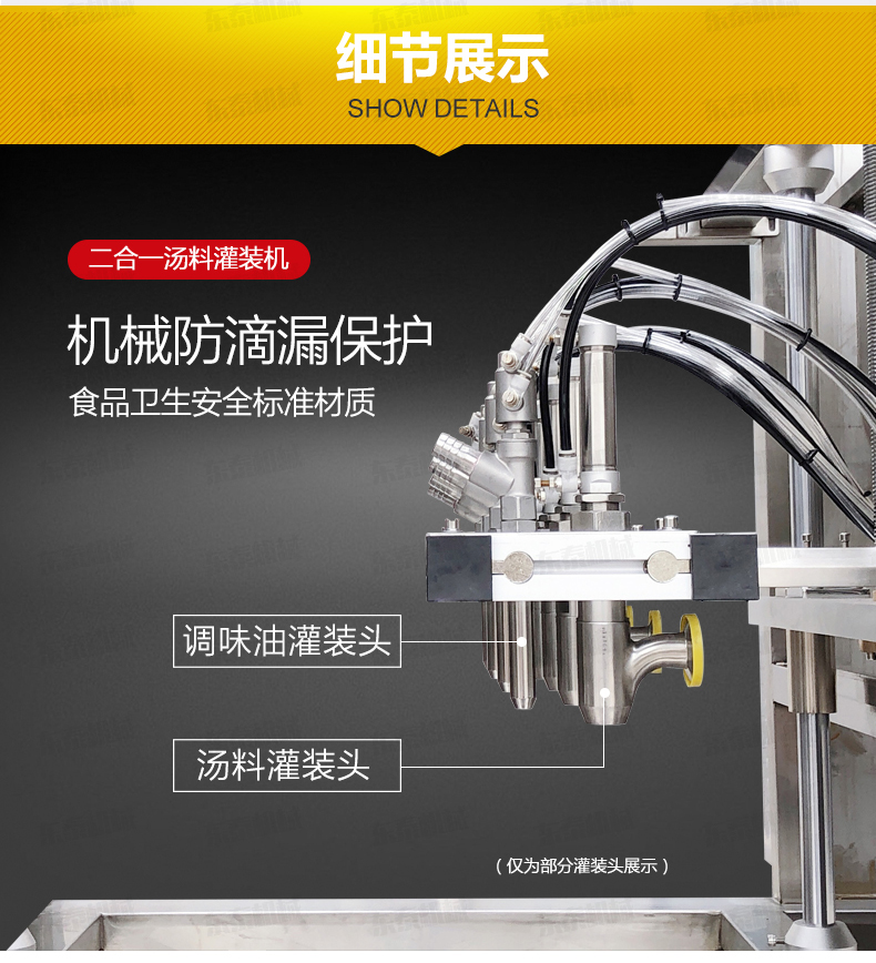 1.灌裝機在參考國外同類產品的基礎上進行改良設計,特制湯料、調味油灌裝頭,機械防滴漏保護,在灌裝過程中不會污染包裝容器。