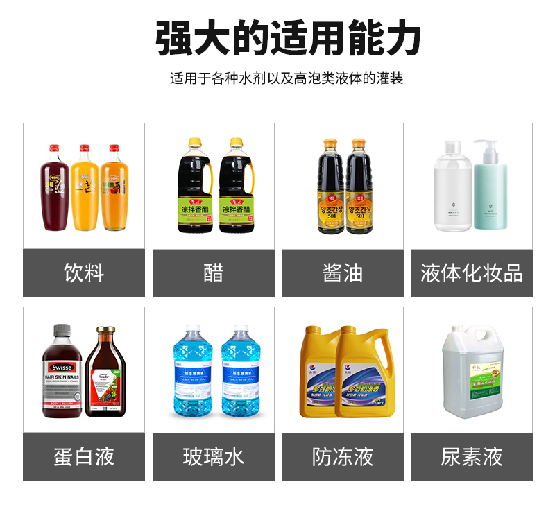 雙頭液體定量灌裝機適用于各種水劑以及高泡類液體的灌裝。如:飲料、醋、醬油、液體化妝品、蛋白液、玻璃水、防凍液、尿素液等