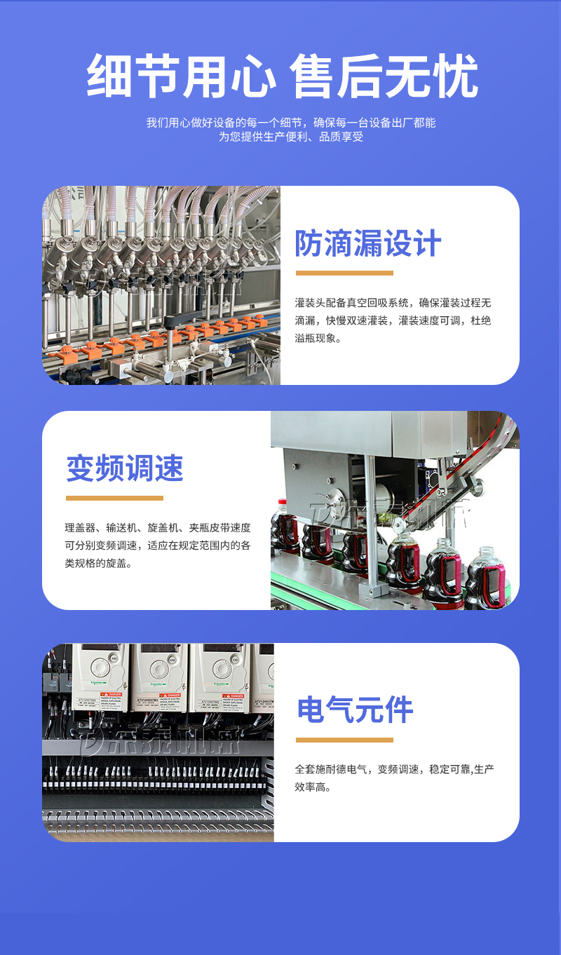本機適用于多種材質,多種幾何形狀的容器,如塑料片、玻璃瓶、金屬瓶等;在需要更換瓶或蓋的時候,只要調整部分零件的位置即可,無需更換任何配件;在旋蓋過程中可以做到無瓶不下蓋。理蓋器、輸送機、旋蓋機、夾瓶皮帶速度可分別變頻調速,適應在規定范圍內的各類規格的旋蓋。(附:特殊規格定制即可)