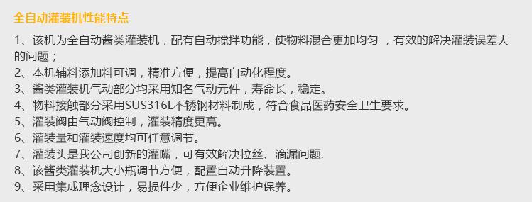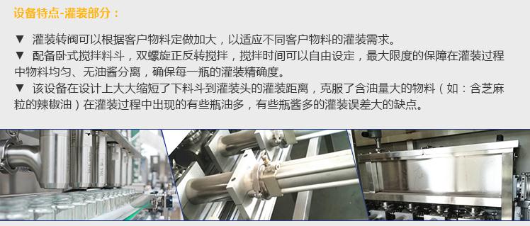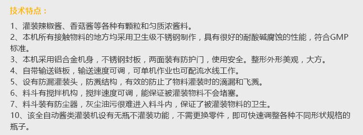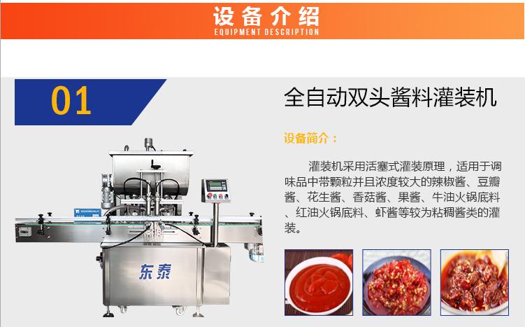 灌裝機采用活塞式灌裝原理,適用于調(diào)味品中帶顆粒并且濃度較大的辣椒醬、豆瓣醬、花生醬、香菇醬、果醬、牛油火鍋底料、紅油火鍋底料、蝦醬等較為粘稠醬類的灌裝。