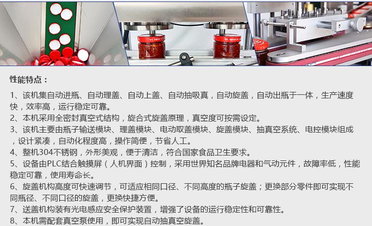 1、該機集自動進瓶、自動理蓋、自動上蓋、自動抽吸真,自動旋蓋,自動出瓶于一體,生產(chǎn)速度快,效率高,運行穩(wěn)定可靠。