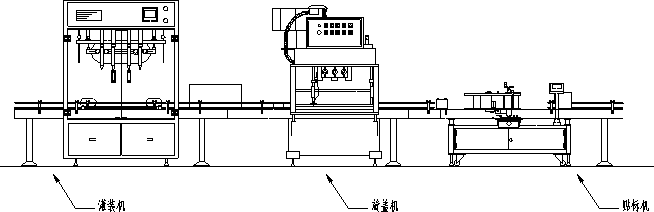 | 方案設計一:灌裝機+壓蓋機+貼標機+自動膠帽熱縮機+噴碼機+封箱機 |