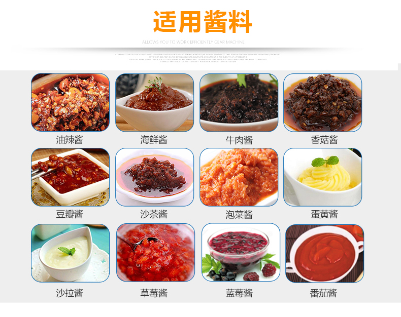 顆粒醬灌裝機采用活塞式灌裝原理,適用于調味品中帶顆粒并且濃度較大的辣椒醬、豆瓣醬、花生醬、香菇醬、果醬、牛油火鍋底料、紅油火鍋底料、蝦醬等較為粘稠醬類的灌裝。