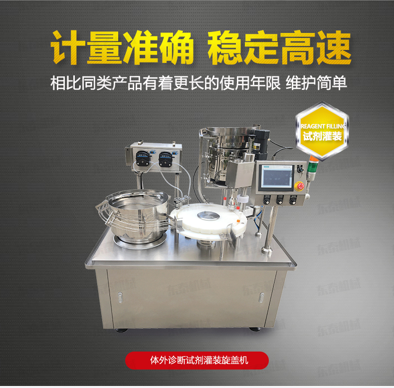 診斷試劑灌裝旋蓋一體機是在引進和吸收國外技術的基礎上,由我公司自主研發的一款IVD診斷試劑灌裝旋蓋一體機,能同時完成自動理瓶、自動上瓶、定量灌裝、自動理蓋、上蓋和旋蓋封口等動作。本機采用日本高精度封閉式凸輪分度工位器,精度高,運行可靠,使用壽命長。該分度器結構簡單,長期使用無需維修。該型號設備主要用于ⅣD體外診斷試劑制藥、生物制藥行業及科研領域裝。機器設計緊湊合理、外形簡潔美觀,灌裝量調節方便。