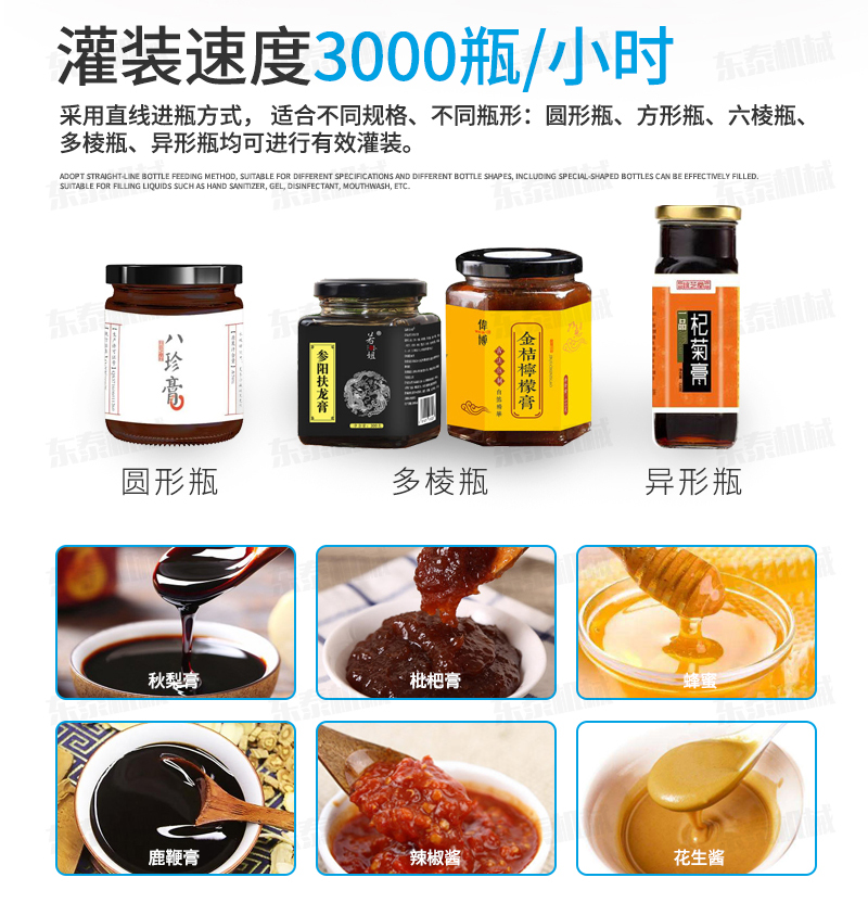 隨著人們對一些產品的質量和外觀要求的日益提高,如秋梨膏、蜂蜜、果醬等已不僅僅是簡單的生活用品,如果說給你一個只是簡易包裝后蜂蜜,面對這樣的產品你會買?你會去吃嗎?大部分的消費者都是拒絕的吧,因此膏體自動灌裝機因為再過程中是做到了全自動化的機械來操作的人工參與的少,這樣就對于食品而言的話,其銷量效果將會越來越高,如今的膏體自動灌裝機加工生產流水線因采用動力系統(tǒng)灌裝,我們就不需要進行配裝就能夠讓你需要包裝的產品達到了眼前一亮。