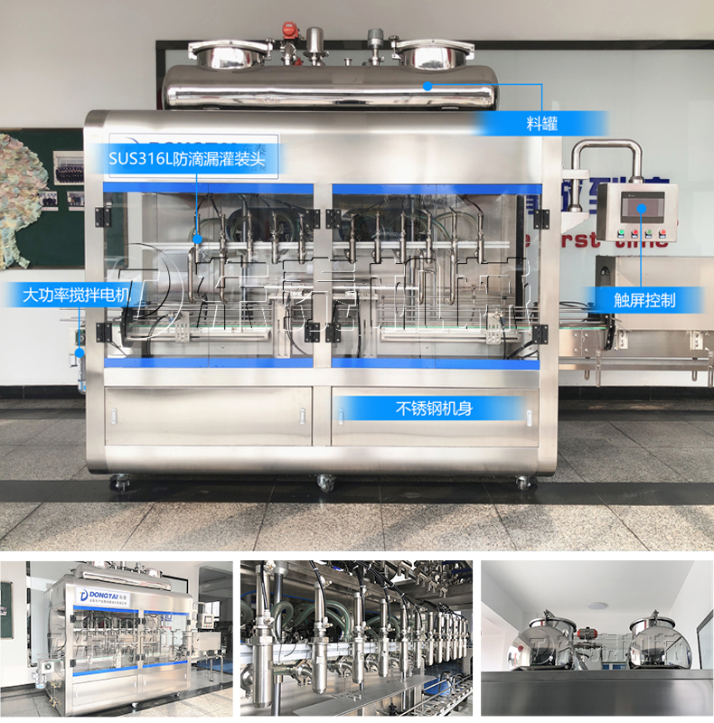 東泰生產(chǎn)的這款醬料灌裝機采用高新灌裝機技術(shù)的基礎(chǔ)上,進(jìn)行改造和創(chuàng)新設(shè)計的產(chǎn)品,配有自動攪拌功能,結(jié)構(gòu)簡單、精確度高、操作更加簡便。它操作方便,氣動部分均采用德國FESTO和臺灣AirTac的氣動元件。灌裝閥由氣動閥控制,灌裝精度更高,灌裝量和灌裝速度均可任意調(diào)節(jié),灌裝悶頭采用防拉絲及升降灌裝裝置,物料接觸部分均采用316L不銹鋼材料制成,符合GMP要求。